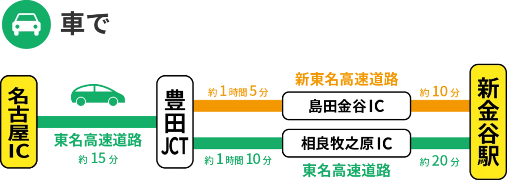 車を使うと、名古屋ICからで約1時間30分〜約1時間45分で新金谷駅に到着!