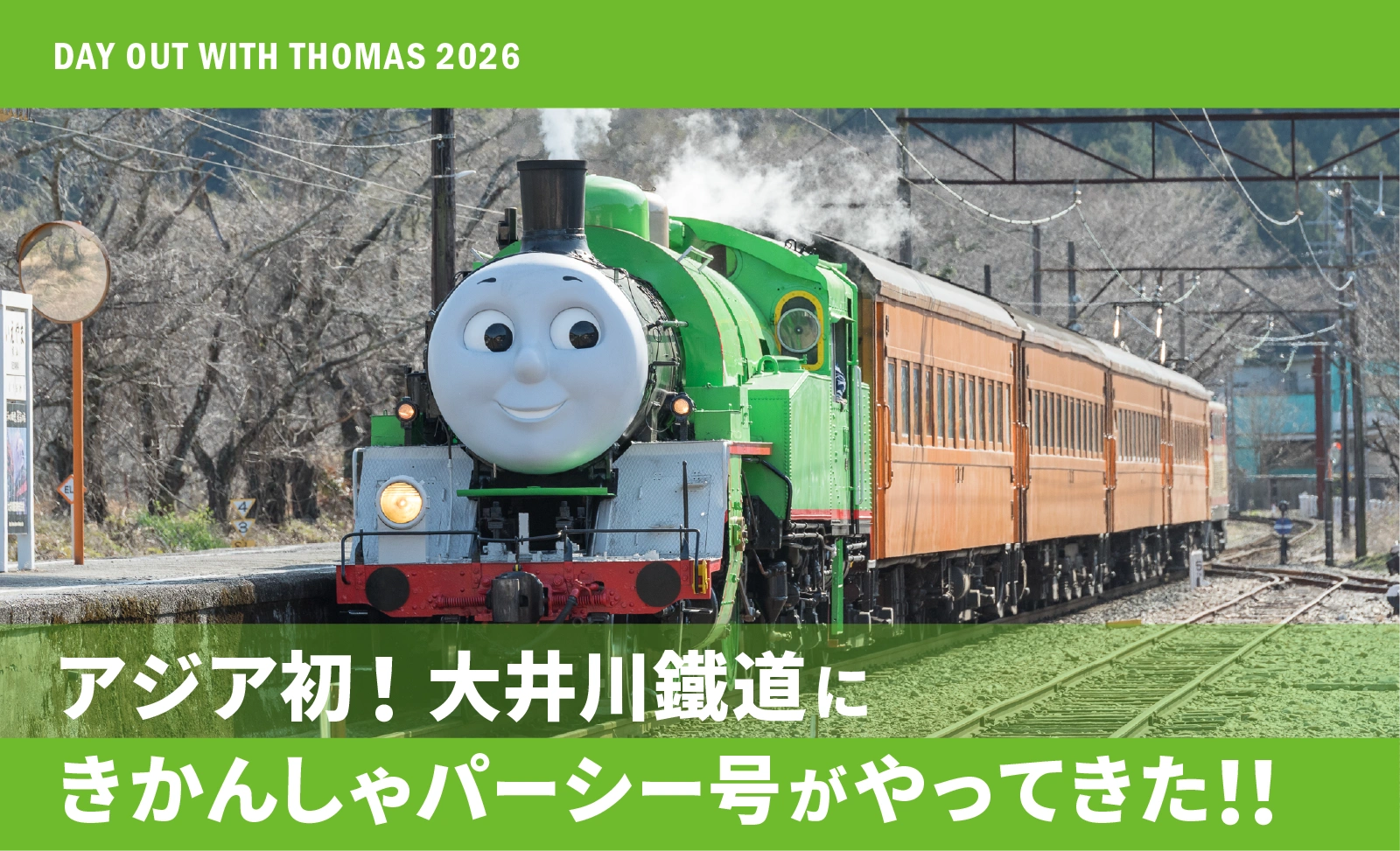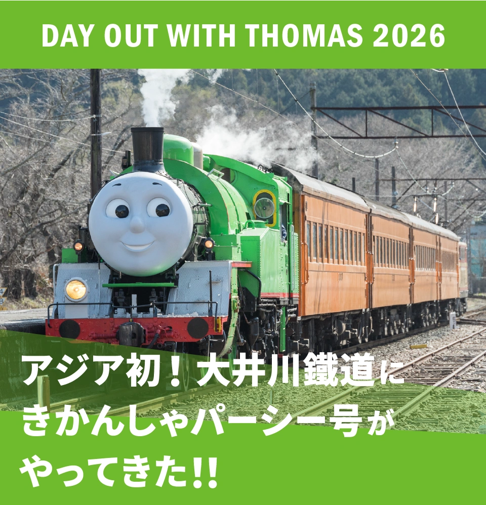トーマスの大親友・パーシーが、今年ついに大井川鐵道で“みんなを乗せて走る機関車”としてデビューするよ。